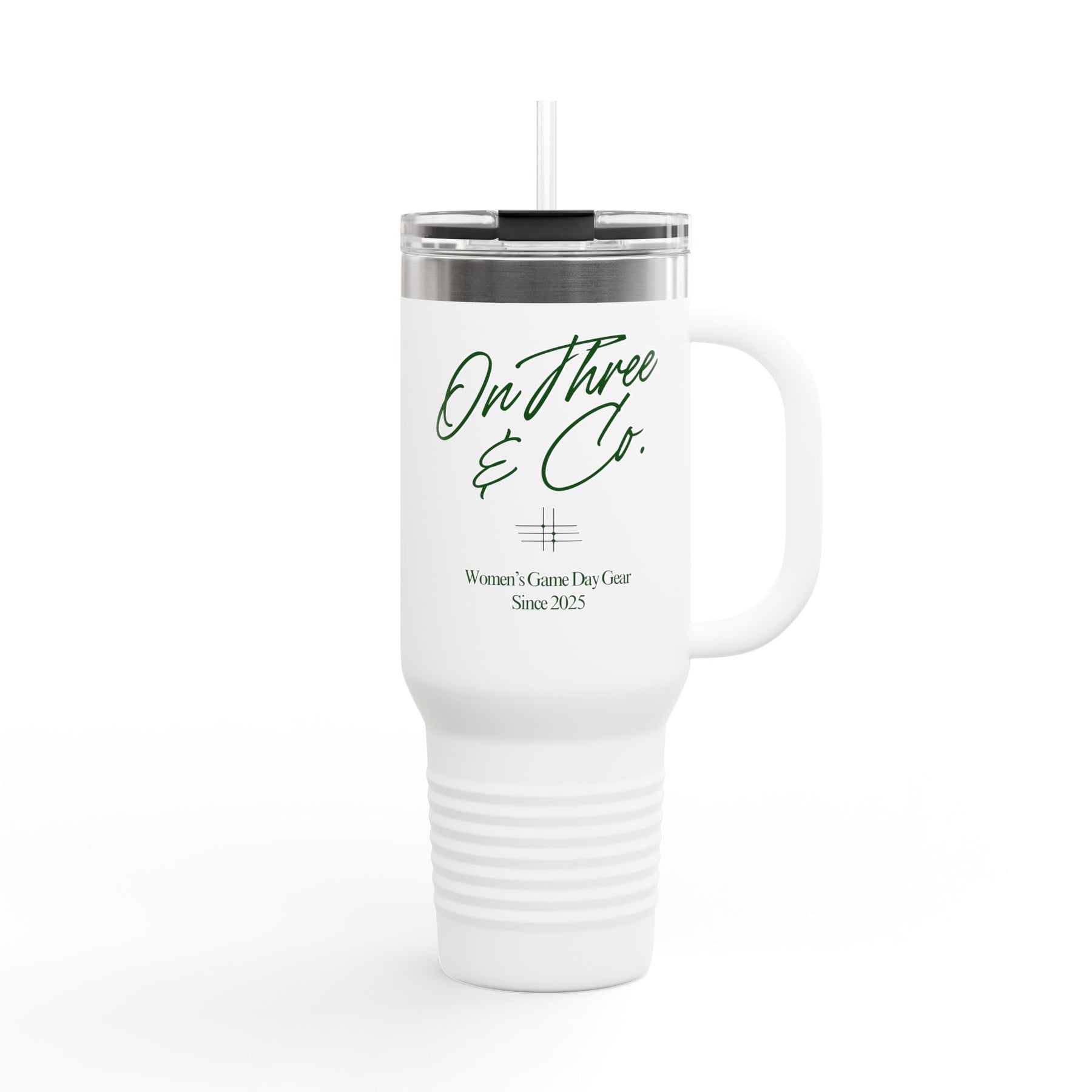 Stay hydrated in style with the On Three & Co. 40oz Tumbler in Spruce with White Font.